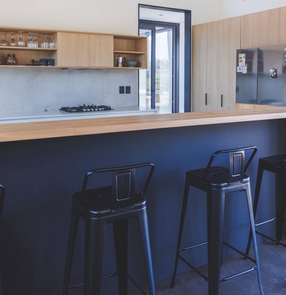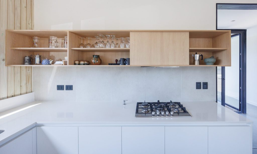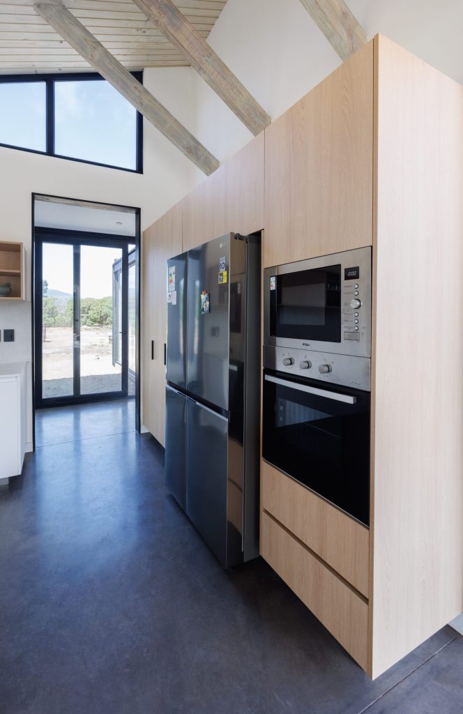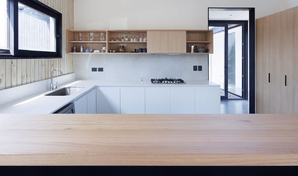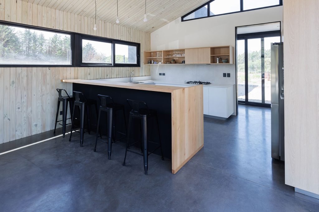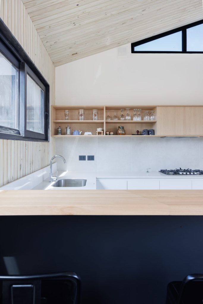 Materialidad: Tablero Fenix en colores blanco y negro mate, madera de Mañío natural y cubiertas en Silestone Blanco Norte.