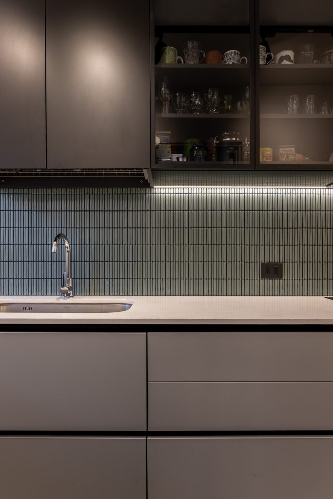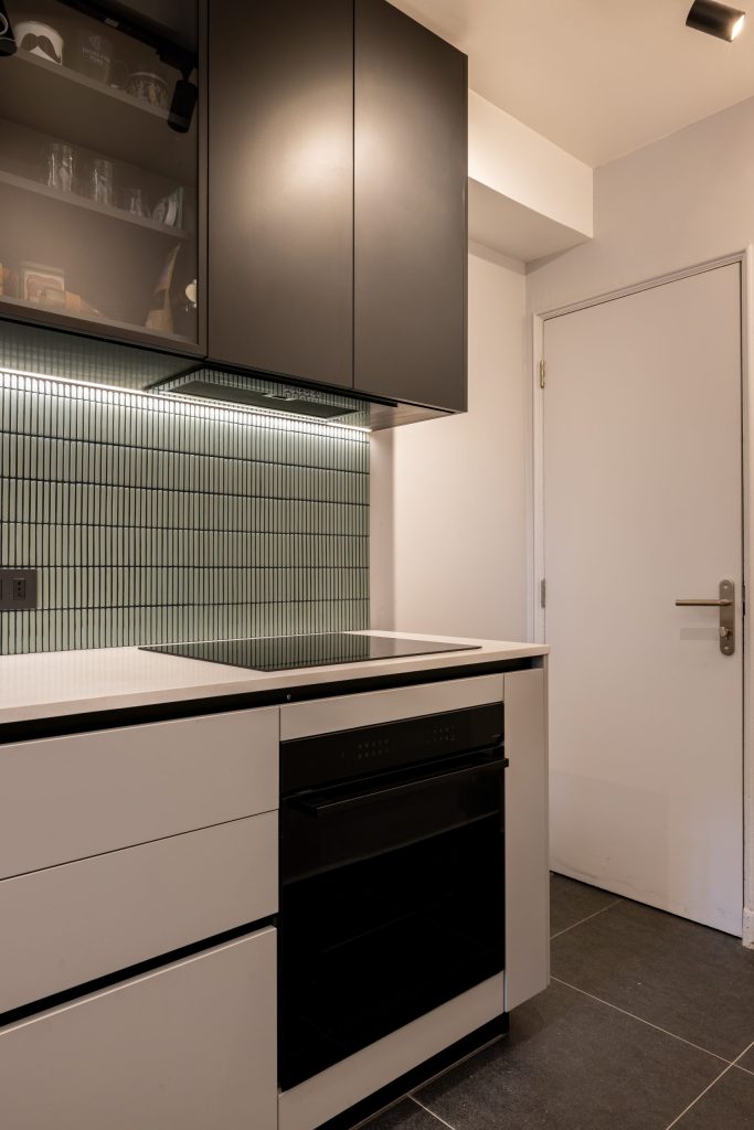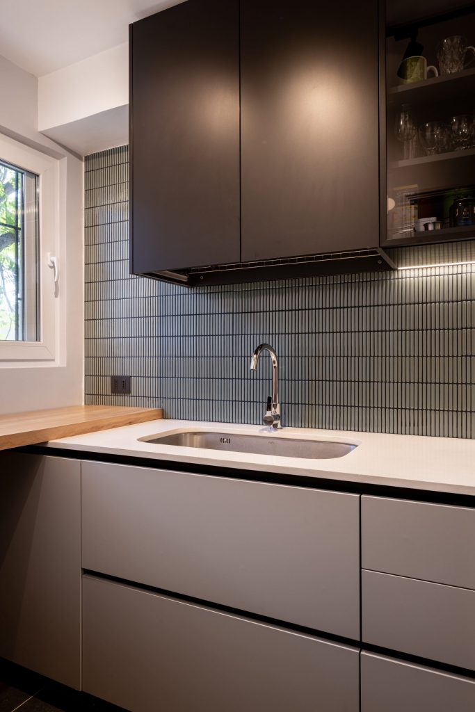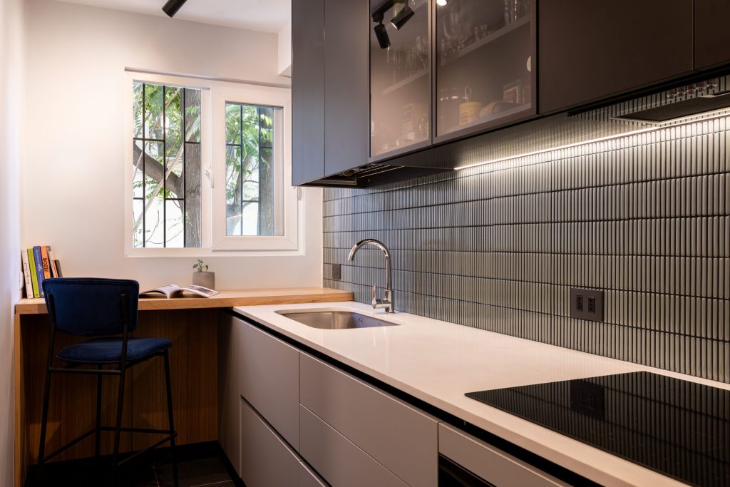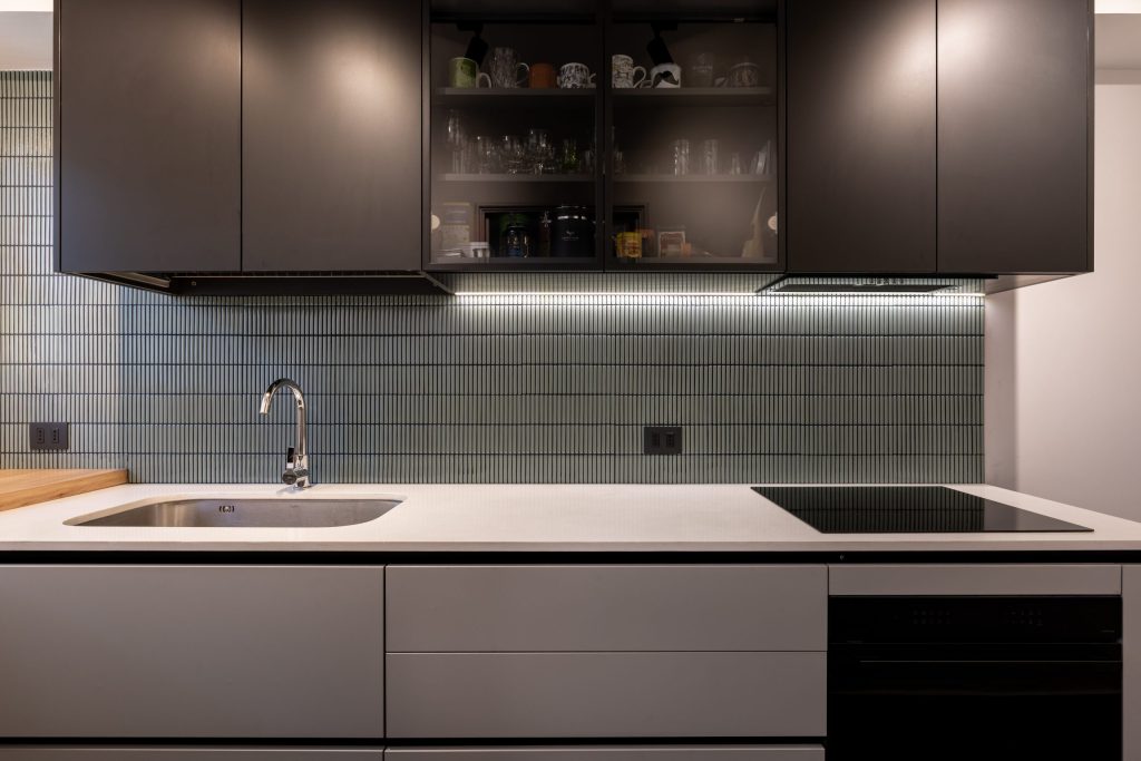 Providencia, Santiago. Diseño y fabricación de mobiliario: Estudio Chercán. Materialidad: Tablero acrílico Stylelite negro y gris mate, madera sólida de Mañío natural y cubiertas en Cuarzo Ártico. Año: 2025.